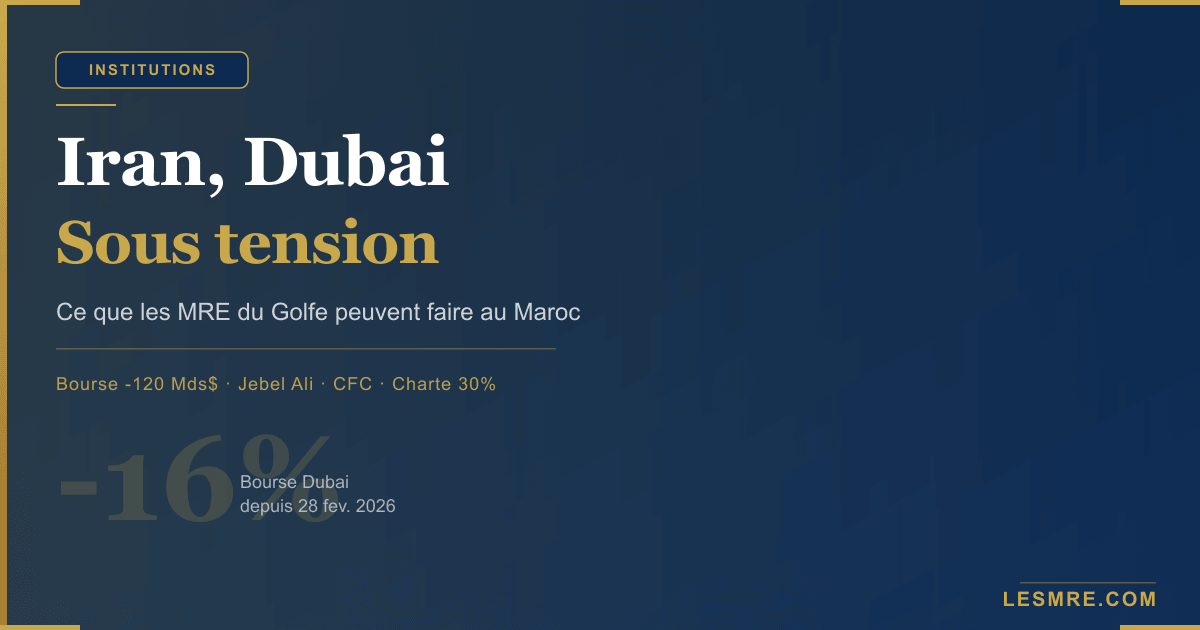 Bourses Dubai et Abu Dhabi en perte de 120 milliards de dollars, Jebel Ali à l'arrêt, Royal Air Maroc qui suspend Casa-Dubai jusqu'au 31 mai : la guerre US-Iran de février 2026 redessine les équilibres du Golfe. Pour les MRE installés à Dubai, Abu Dhabi, Doha ou Riyad, le Maroc offre une alternative crédible mais sous conditions précises. Décryptage des dispositifs réellement disponibles, sans embellissement.