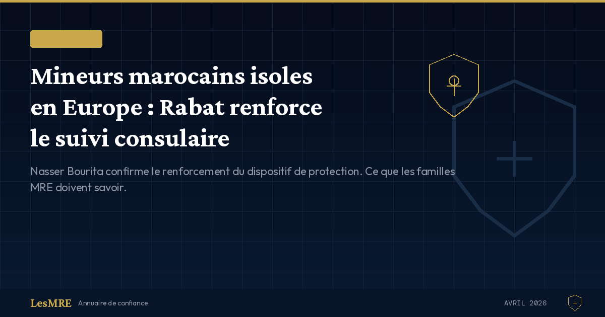 Le 6 avril 2026, le ministre des Affaires etrangeres Nasser Bourita a confirme devant le Parlement que des instructions ont ete donnees a l'ensemble des missions diplomatiques et consulats marocains pour suivre les cas de mineurs marocains isoles a l'etranger. Un sujet qui touche directement les familles de la diaspora.